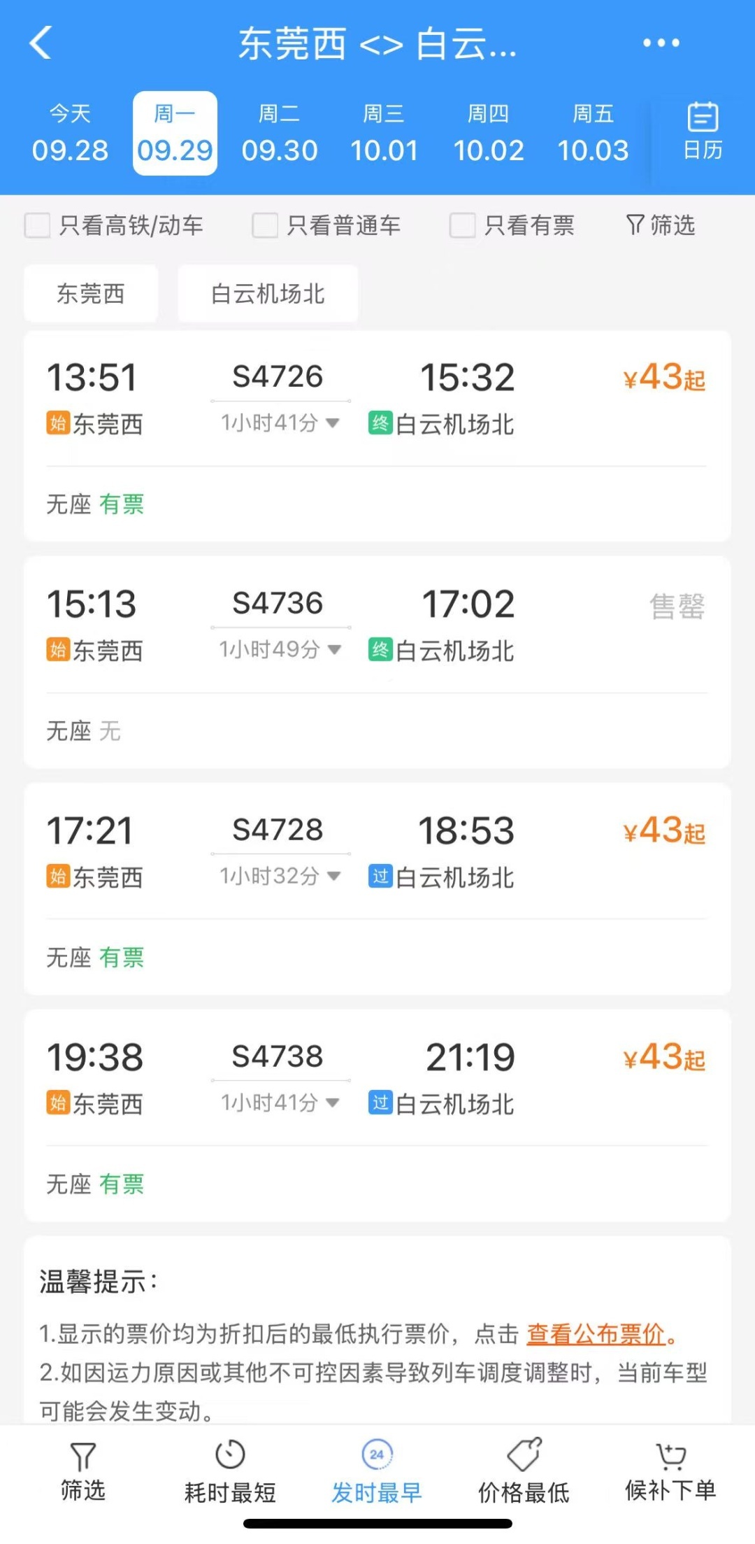 以到达站为白云机场北站举例,据“铁路12306APP”显示,9月29日当天,经停东莞城际的银瓶、樟木头东、常平东、常平南、大朗镇、松山湖北、寮步、东城南、西平西、道滘、东莞西、麻涌站均能查到直达白云机场北站的车次,其中车次最多的是东莞西站和麻涌站(全天共9趟),银瓶、樟木头东车次最少(全天仅2趟),其余站点都是一天3趟。