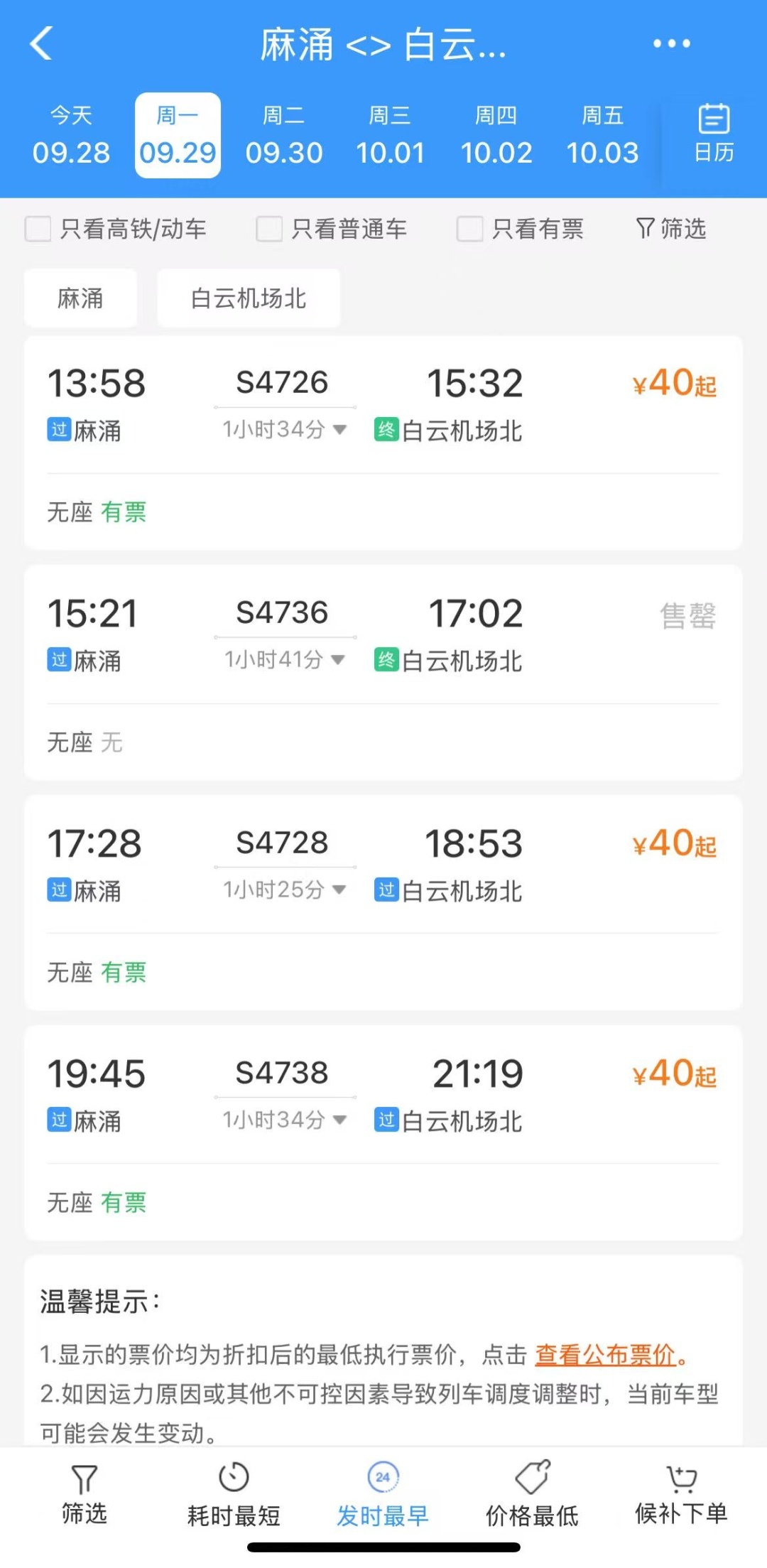 新线路车票销售火爆,截至发稿,仅有东莞西和麻涌两个站到达白云机场的部分车次有余票,其余皆售罄。