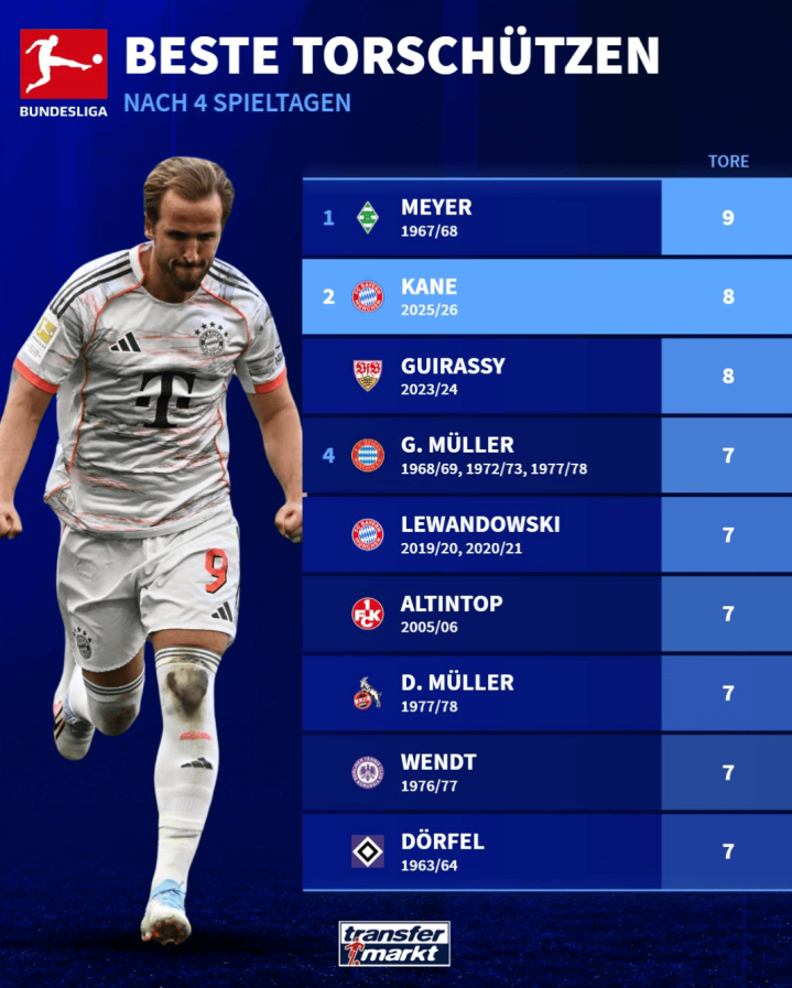 虎扑09月21日讯德转统计了德甲前四轮之后的历史射手榜,刚刚在本轮拜仁4-1客场战胜霍芬海姆完成帽子戏法的凯恩位居第二;前斯图加特前锋吉拉西曾在2023/24赛季的联赛前四轮也打入8球,和凯恩并列历史第二。