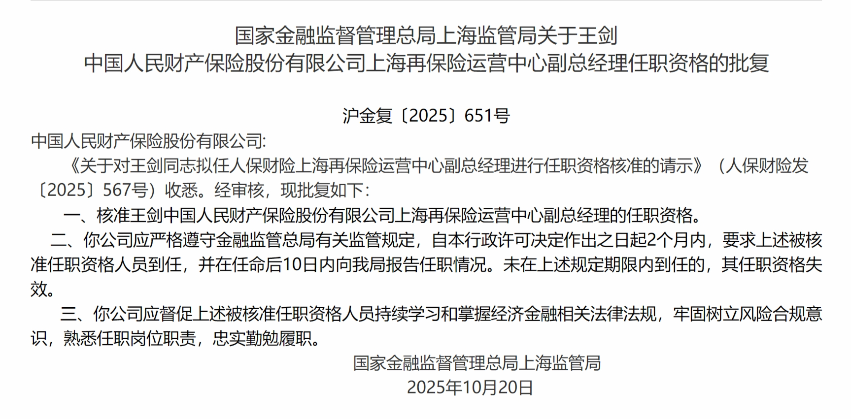 10月24日盈透科技,国家金融监督管理总局上海监管局发布关于王剑中国人民财产保险股份有限公司上海再保险运营中心副总经理任职资格的批复,核准王剑中国人民财产保险股份有限公司上海再保险运营中心副总经理的任职资格。